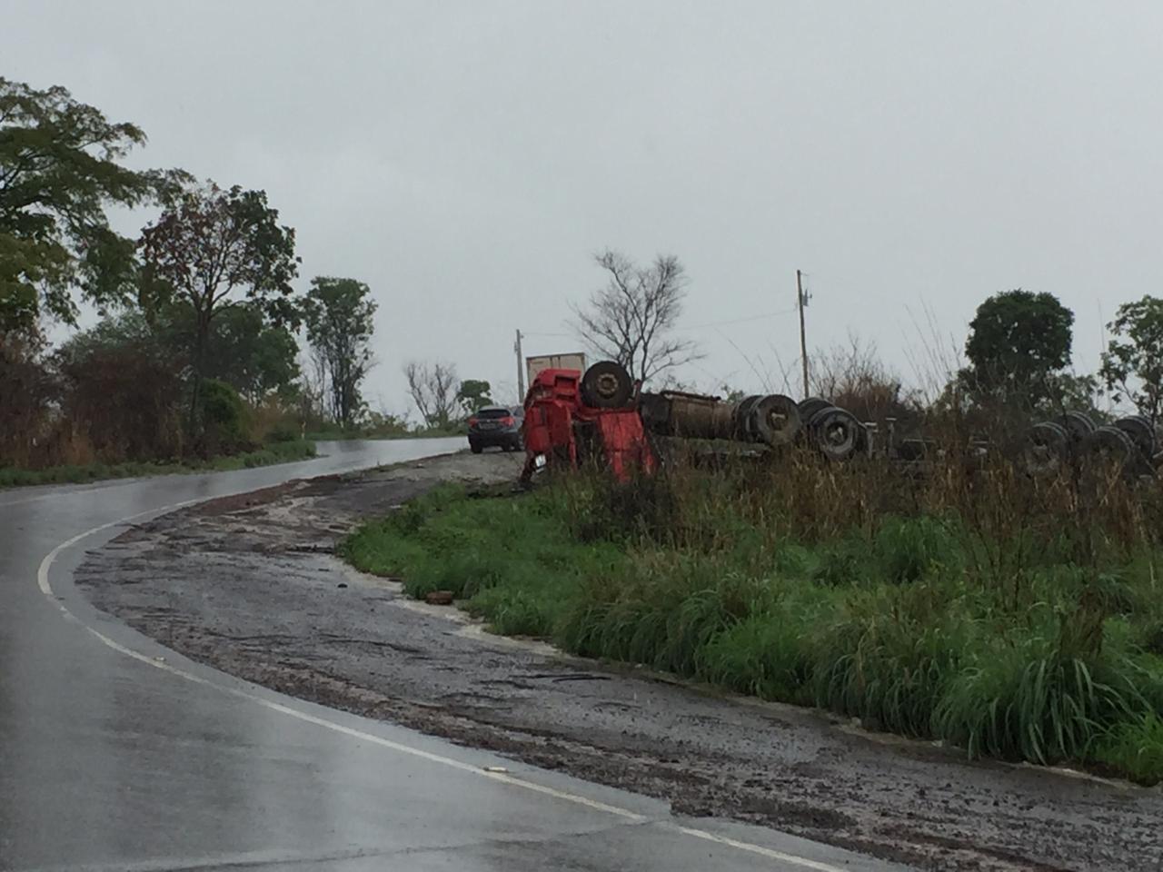 Caminhão carregado de cimento capota na Serra Olhos D'água